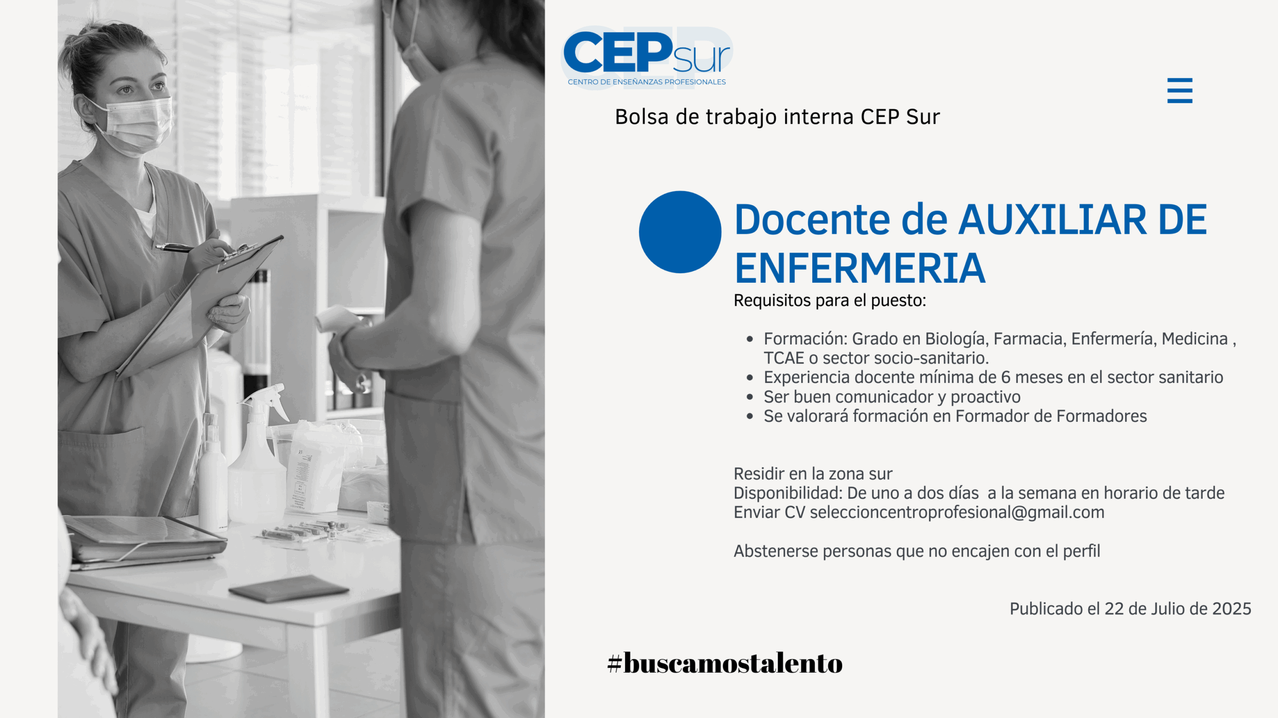 Empleo: CEPsur busca docente de Auxiliar de Enfermería