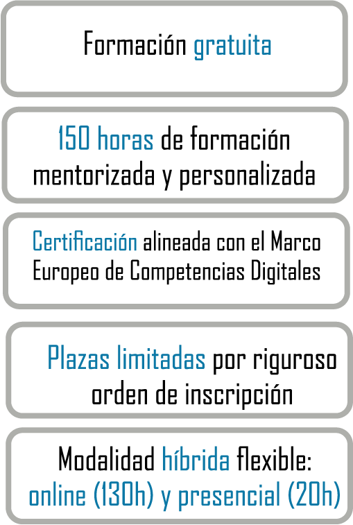 Estimada/o compañera/o, tu Colegio Oficial de Enfermería de S/C de Tenerife, ofrece una oportunidad única para adquirir, aumentar y consolidar conocimientos en un ámbito clave para la sanidad y la sociedad actual, como lo son: las competencias digitales y la inteligencia artificial. Gracias a los fondos europeos Next Generation, “Unión Profesional”, entidad que agrupa a todas las profesiones y actúa como canalizadora del programa “Formación en competencias digitales para profesionales”, ha puesto en marcha esta iniciativa que, en nuestro caso, se desarrolla a través del Consejo General de Enfermería. Esta formación se ofrece de forma totalmente gratuita, con el compromiso de completar la formación. La formación tiene una duración total de 150 horas, estructuradas en dos bloques principales: